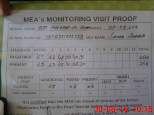 | Attendance Register | Head Teacher | MEA with School | Visit Proof |