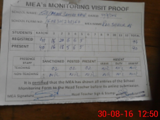 | Attendance Register | Head Teacher | MEA with School | Visit Proof |