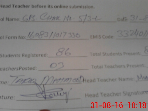 | Name: MTA**** AB**** Designation: (School Headmaster's/Headmistress's) PST Phone/Cell Number: 03**** |