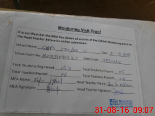 | Attendance Register | Head Teacher | MEA with School | Visit Proof |