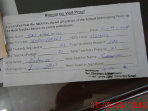 | Attendance Register | Head Teacher | MEA with School | Visit Proof |