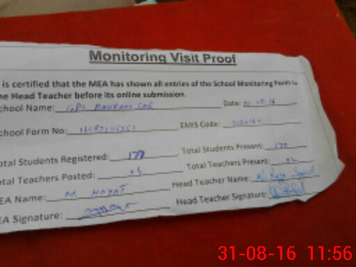 | Attendance Register | Head Teacher | MEA with School | Visit Proof |