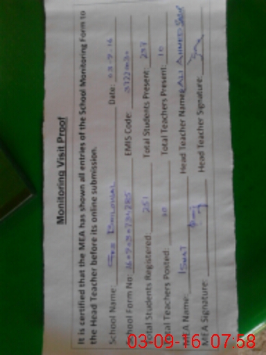 | Attendance Register | Head Teacher | MEA with School | Visit Proof |