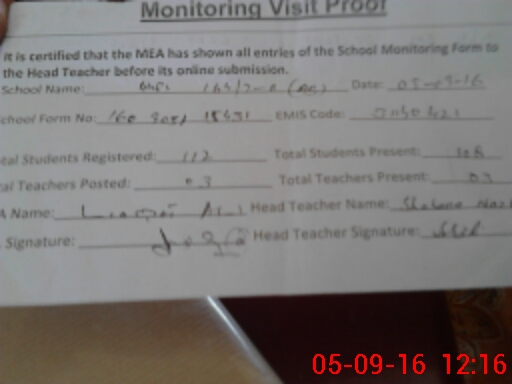 | Attendance Register | Head Teacher | MEA with School | Visit Proof |