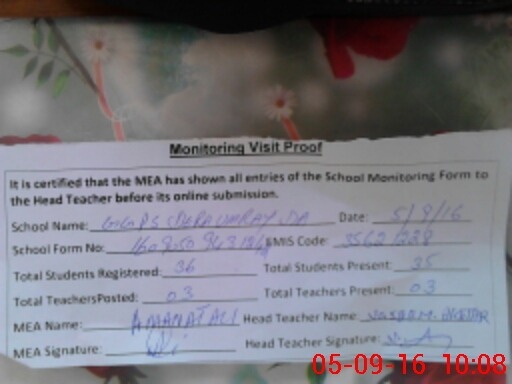 | Attendance Register | Head Teacher | MEA with School | Visit Proof |