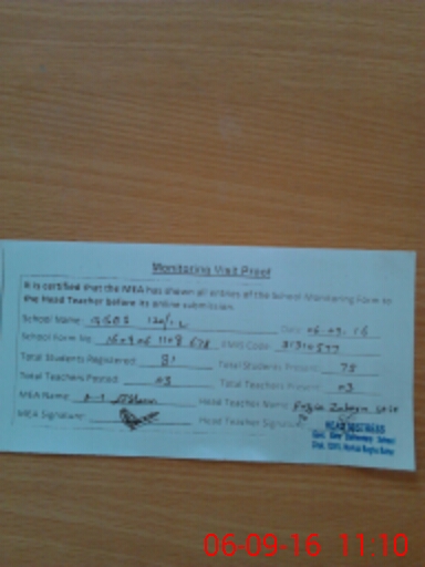 | Attendance Register | Head Teacher | MEA with School | Visit Proof |