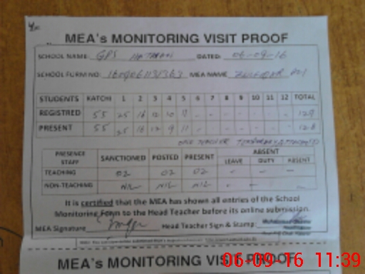 | Attendance Register | Head Teacher | MEA with School | Visit Proof |