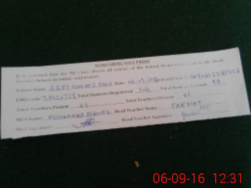 | School Visited by School Health & Nutrition Supervisor (No. of Visits) | 1 | Name1: | Muhammad Hasnain | Name2: | |