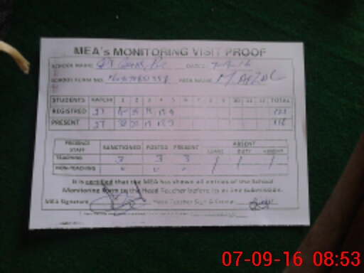 | Attendance Register | Head Teacher | MEA with School | Visit Proof |