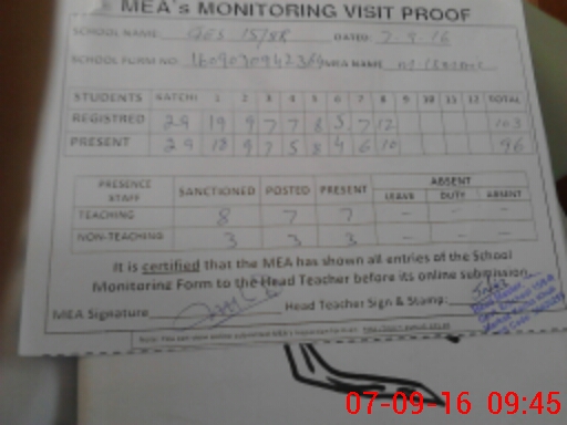 | Attendance Register | Head Teacher | MEA with School | Visit Proof |