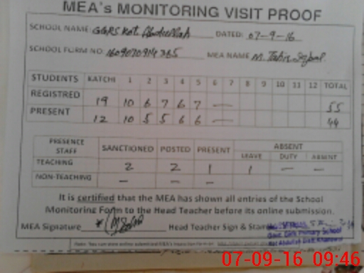 | Attendance Register | Head Teacher | MEA with School | Visit Proof |