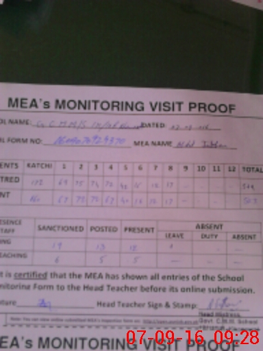 | Attendance Register | Head Teacher | MEA with School | Visit Proof |