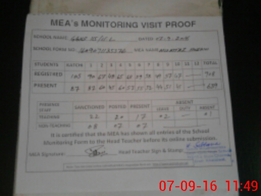| Attendance Register | Head Teacher | MEA with School | Visit Proof |