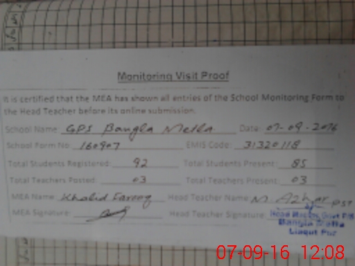 | Attendance Register | Head Teacher | MEA with School | Visit Proof |