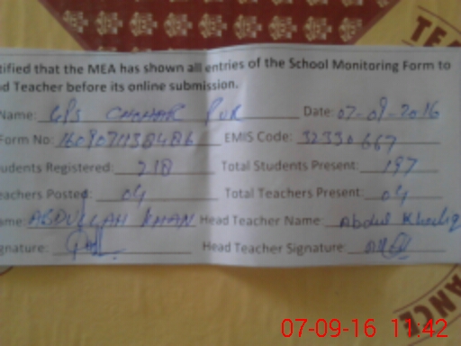 | Name: AB**** KH**** Designation: (School Headmaster's/Headmistress's) PST/PTC/JV Phone/Cell Number: 03**** |