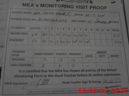 | Attendance Register | Head Teacher | MEA with School | Visit Proof |