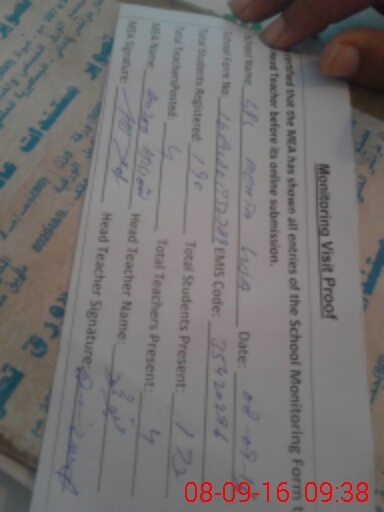 | School Visited by School Health & Nutrition Supervisor (No. of Visits) | Name1: | Ali Ahmed Zia | Name2: | ||