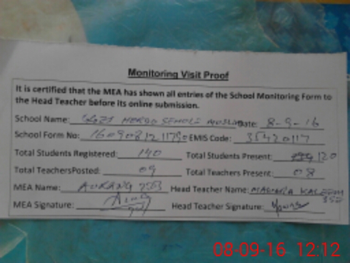 | Attendance Register | Head Teacher | MEA with School | Visit Proof |
