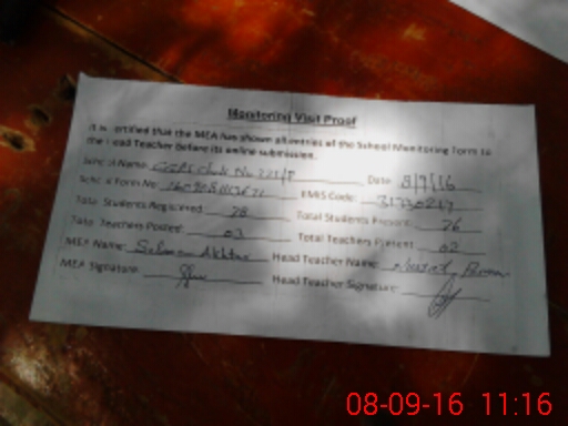 | Attendance Register | Head Teacher | MEA with School | Visit Proof |