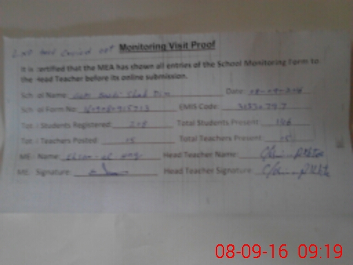 | Attendance Register | Head Teacher | MEA with School | Visit Proof |