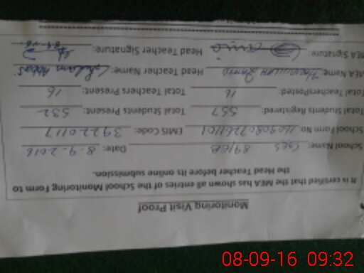 | Attendance Register | Head Teacher | MEA with School | Visit Proof |
