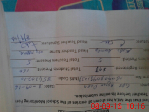 | Monitoring Date: 08-09-2016 | Start Time: 08-09-2016 09:37 AM | End Time: 08-09-2016 10:22 AM | Name of MEA: Ej**** Ah**** Kh**** (R**** | |