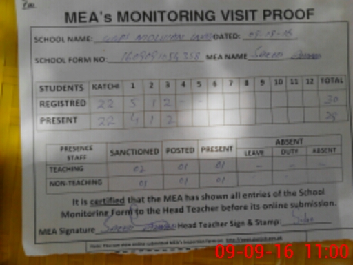 | Attendance Register | Head Teacher | MEA with School | Visit Proof |