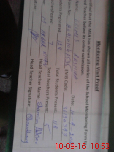 | School Visited by School Health & Nutrition Supervisor (No. of Visits) | 1 | Name1: | HASHIM MEHMOOD | Name2: | |