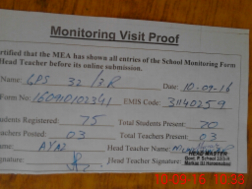 | Attendance Register | Head Teacher | MEA with School | Visit Proof |