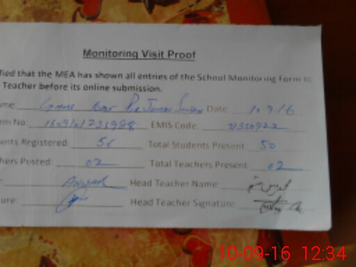 | Attendance Register | Head Teacher | MEA with School | Visit Proof |