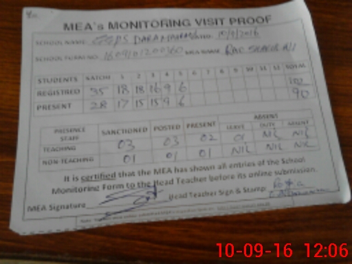 | Attendance Register | Head Teacher | MEA with School | Visit Proof |