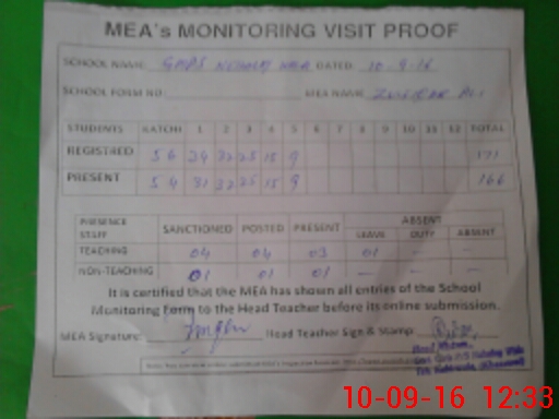 | Attendance Register | Head Teacher | MEA with School | Visit Proof |