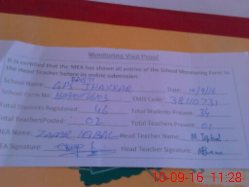 | Attendance Register | Head Teacher | MEA with School | Visit Proof |