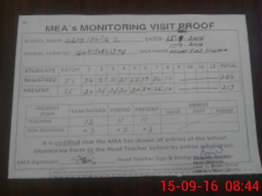 | Attendance Register | Head Teacher | MEA with School | Visit Proof |