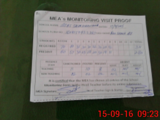 | Attendance Register | Head Teacher | MEA with School | Visit Proof |
