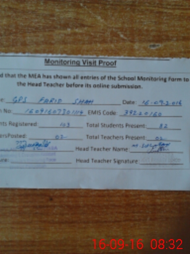 | EMIS Code: 39220160 | Name of School: GPS FARID SHAH | |||