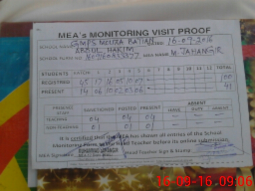 | Attendance Register | Head Teacher | MEA with School | Visit Proof |