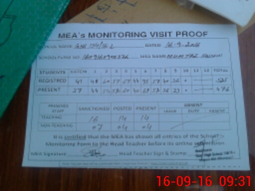 | Attendance Register | Head Teacher | MEA with School | Visit Proof |
