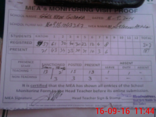 | Attendance Register | Head Teacher | MEA with School | Visit Proof |