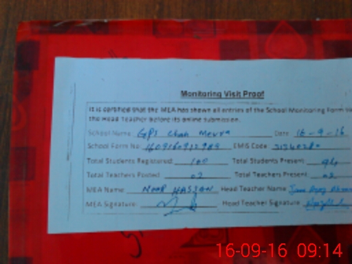 | Attendance Register | Head Teacher | MEA with School | Visit Proof |
