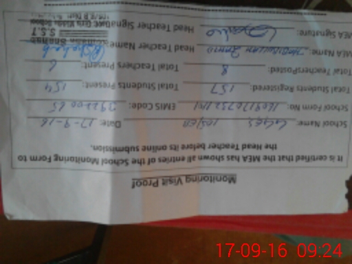 | Attendance Register | Head Teacher | MEA with School | Visit Proof |