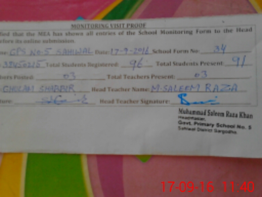 | EMIS Code: 38450215 | Name of School: GPS NO.5 SAHIWAL | |||