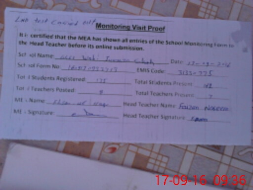 | Attendance Register | Head Teacher | MEA with School | Visit Proof |