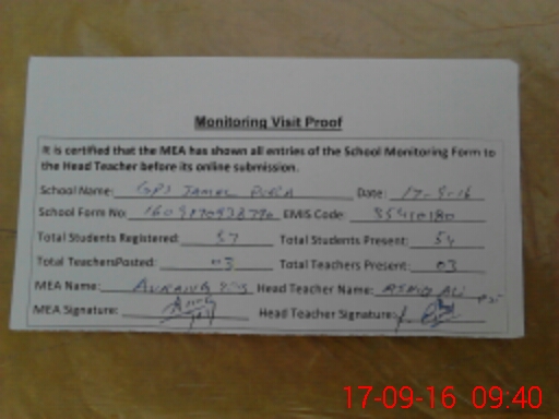 | Attendance Register | Head Teacher | MEA with School | Visit Proof |