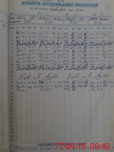 | CNIC | Full Name | Designation | R/C | Absence During Last Calender Month |