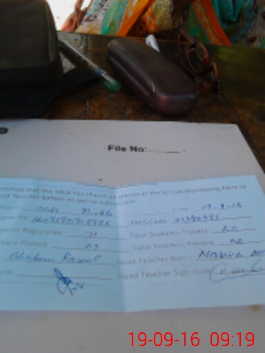 | Remarks (Use Separate Page if Required): Record of visit has been made NA becaue of non availability of previous register which is kept under lock and key is held with head teacher | |||||