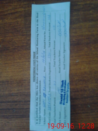 | School Visited by School Health & Nutrition Supervisor (No. of Visits) | Name1: | Moajaz Ali Shah | Name2: | ||