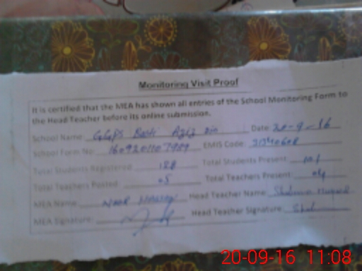 | Attendance Register | Head Teacher | MEA with School | Visit Proof |