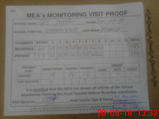 | Attendance Register | Head Teacher | MEA with School | Visit Proof |
