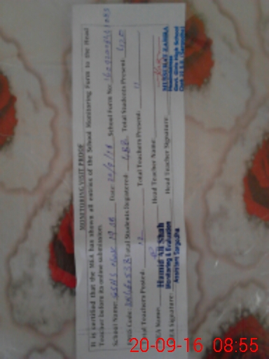 | School Visited by School Health & Nutrition Supervisor (No. of Visits) | 1 | Name1: | Moajaz Ali Shah | Name2: | |